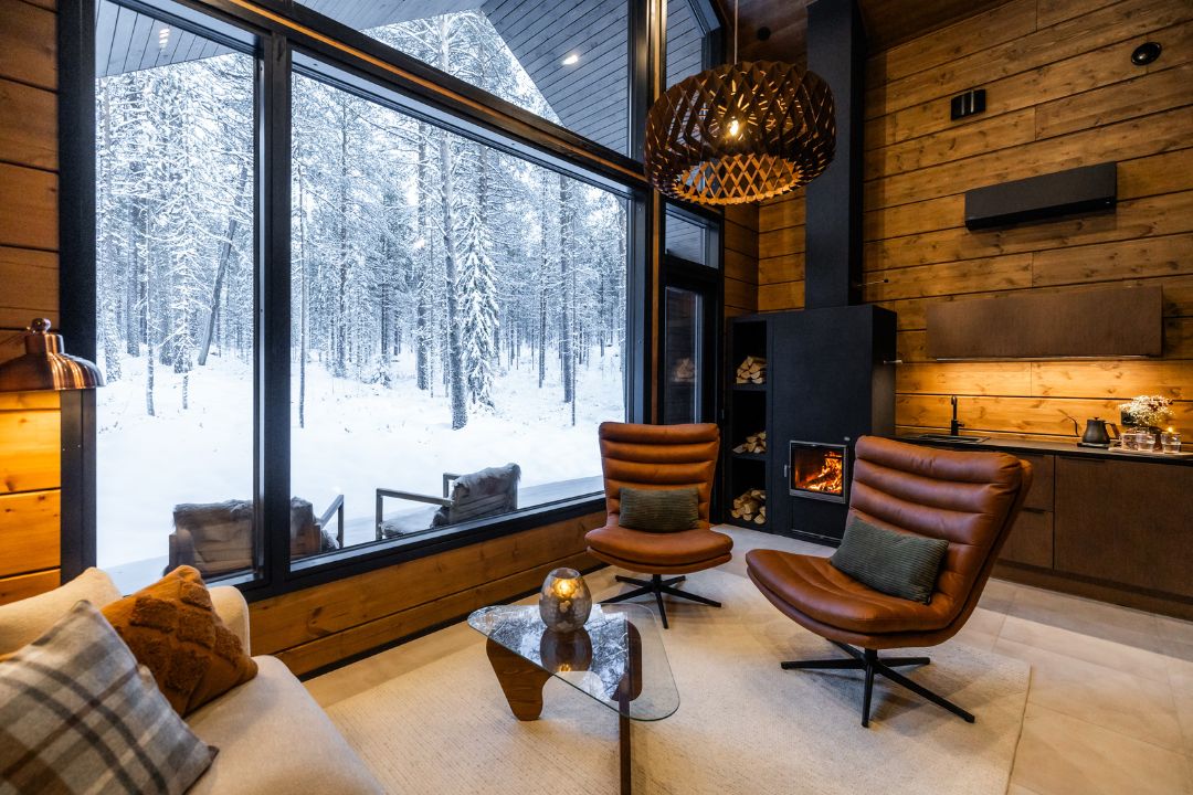 Each 67 m² cabin features a private terrace with forest view. Bedroom downstairs with a window facing the courtyard and a handmade 180cm premium bed that can be set as double or twin. Bathroom facilities with private sauna with a forest-view window, two showers, vanity station and a separate toilet. Living room with 6-meter-tall floor-to-ceiling forest-view windows, seating area, fireplace, minibar area and a TV. Upstairs a peaceful loft with yoga equipment and a writing desk as well as two armchairs. Two 100cm wide extra beds available to be set on the loft.
