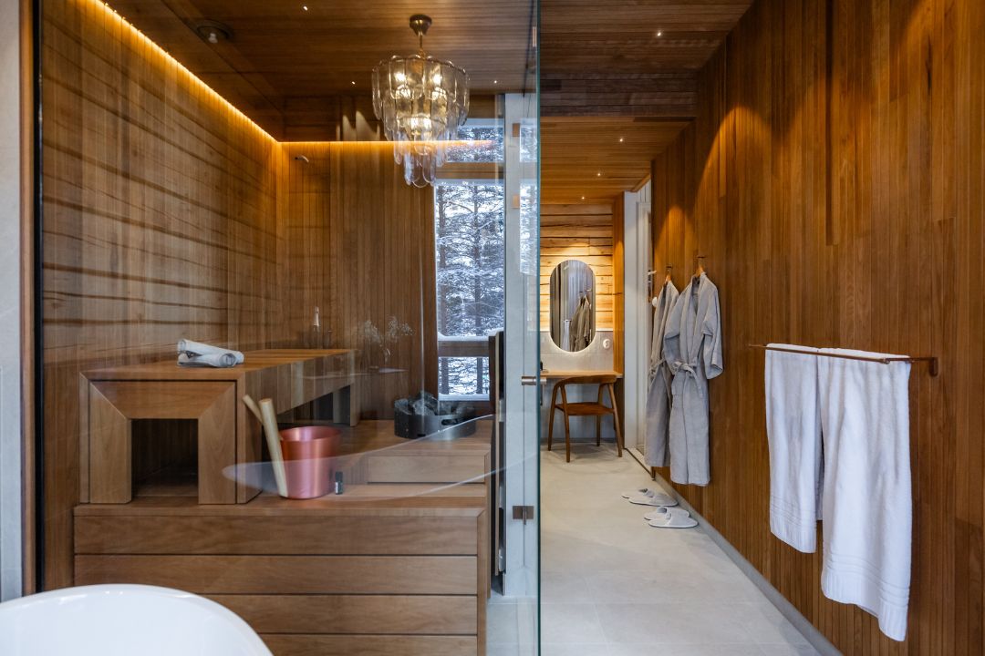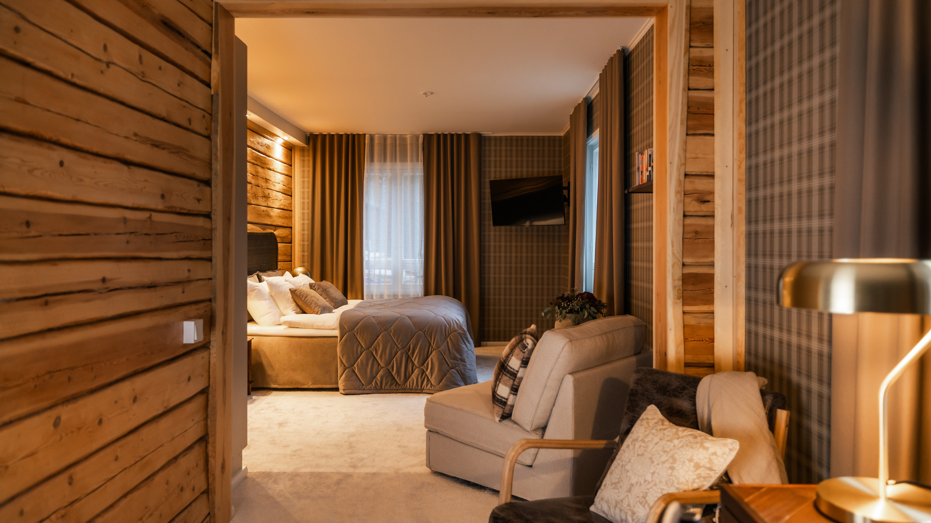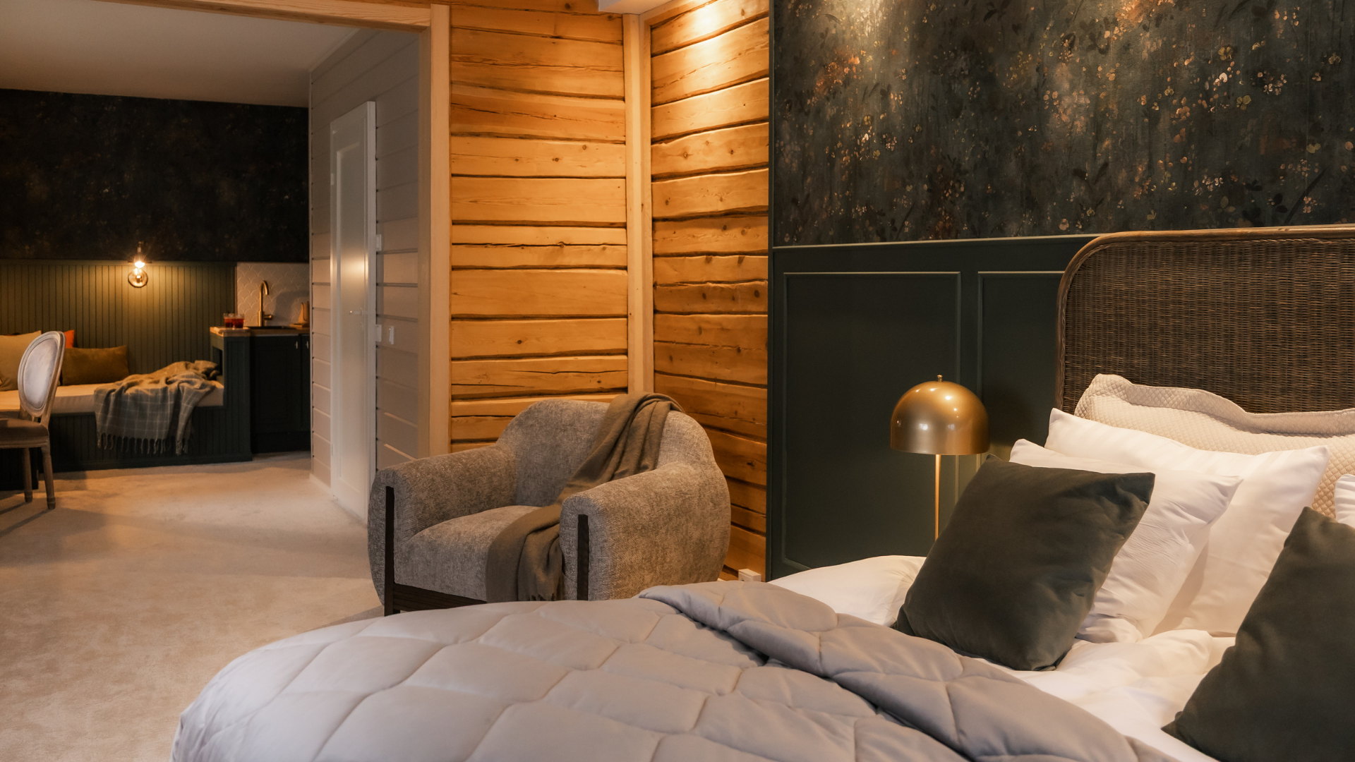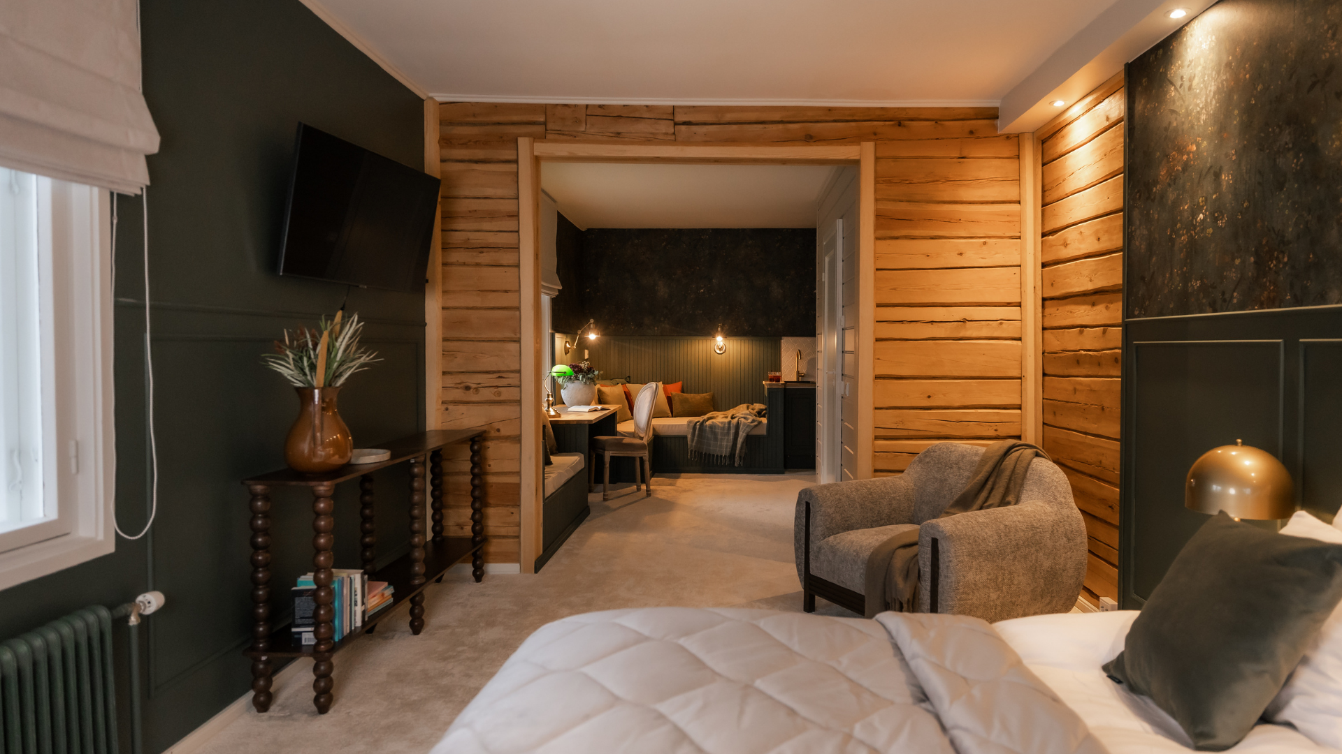 Our two Grande Suites sit at the heart of the old village schoolhouse, where sunlight once spilled across classroom floors. Now, these nearly 60 m² suites feature hand-restored 70-year-old log walls, original windows, and details that blend heritage with high-end comfort. A private sauna, deep bathtub, and champagne button for small indulgences complete the space.