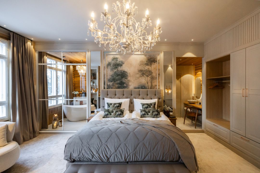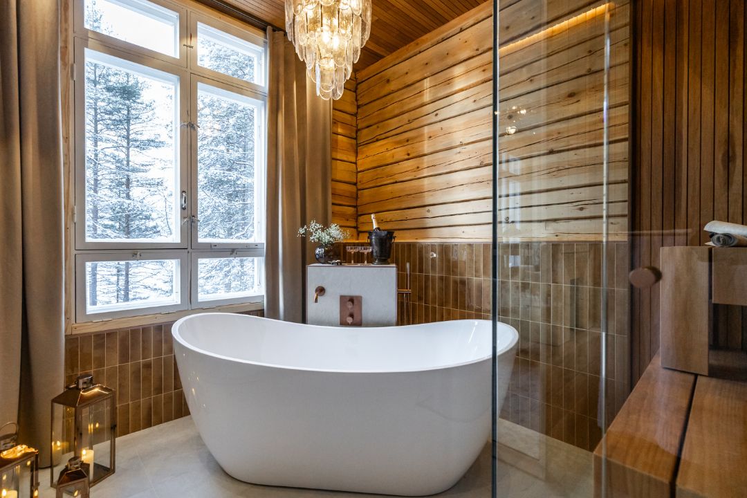 Each 50–60 m² suite is a breathtaking blend of handcrafted elegance and refined Nordic design. Every detail has been thoughtfully curated to create an atmosphere of quiet luxury and intimacy. The centerpiece is an exceptional, handcrafted Finnish 200 cm bed, complemented by fine bedding and natural materials. The luxurious bathroom features a private Finnish sauna and a deep bathtub for rose-scented baths, a thoughtfully designed vanity desk for beauty rituals, and a champagne button to summon room service at the perfect moment. The suite also includes yoga equipment, a writing desk, and two armchairs for peaceful moments of reflection.
