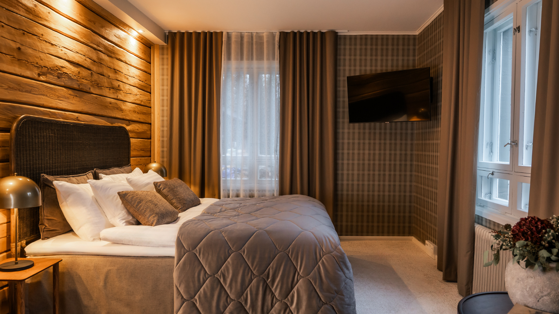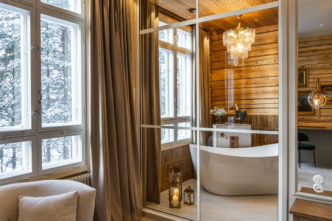These two unique historical suites (33m²) once housed the school’s teachers, and now host pairs traveling to Lapland. With original log walls, curated books, and interiors paying tribute to Nordic design heritage, these spaces feel lived-in, meaningful, and warm.
